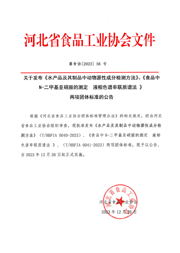 以上為河北省食品工業協會關于發布《水產品及其制品中動物源性成分檢測方法》、《食品中N-二甲基亞硝胺的測定 液相色譜串聯質譜法》兩項團體標準的公告(冀食協[2023]56號)的檢測服務介紹,如有其他疑問可聯系在線工程師!
