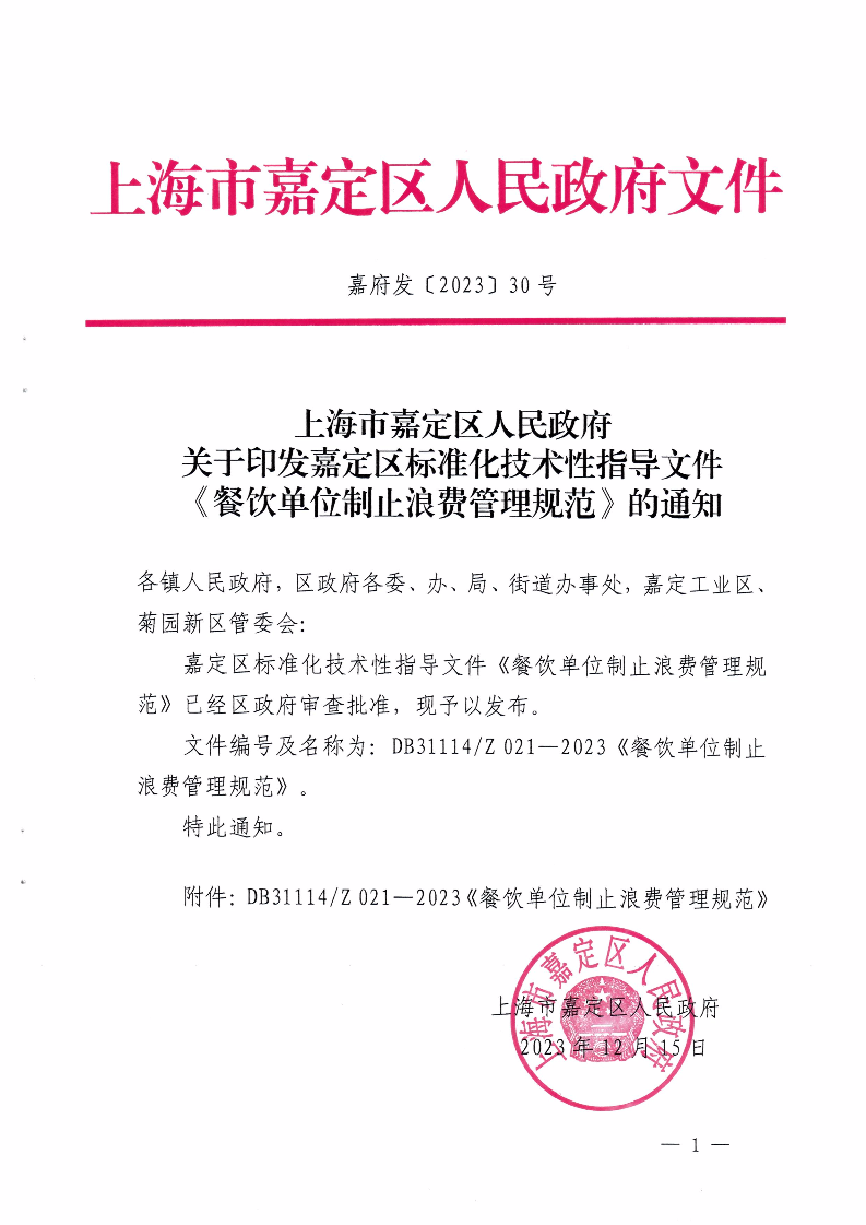 文件編號及名稱為:DB31114/Z 021—2023《餐飲單位制止浪費(fèi)管理規(guī)范》。