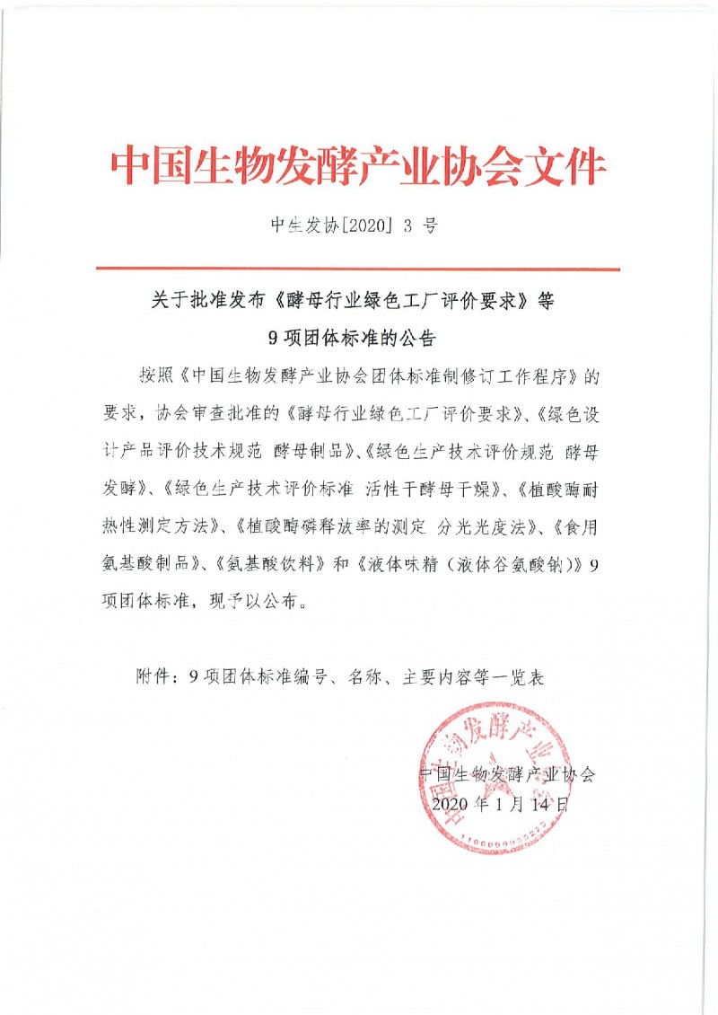 以上為中國生物發酵產業協會關于批準發布《酵母行業綠色工廠評價要求》《氨基酸飲料》等9項團體標準的公告(中生發協[2020]3號)的檢測服務介紹,如有其他疑問可聯系在線工程師!