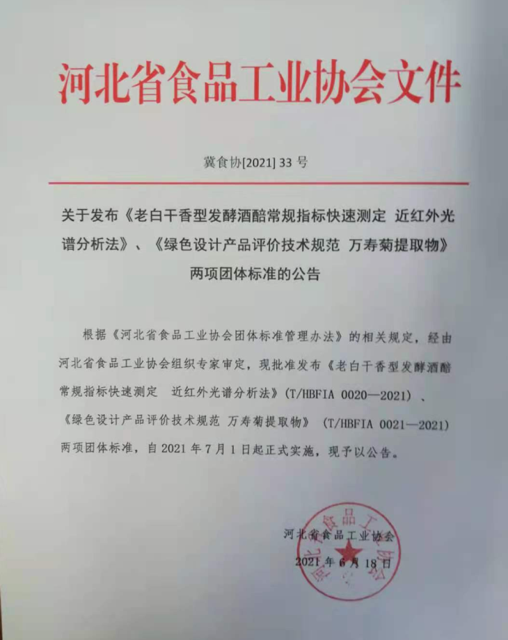 T/HBFIA 0020-2021 老白干香型發(fā)酵酒醅常規(guī)指標(biāo)快速測定 近紅外光譜分析法 T/HBFIA 0021-2021 綠色設(shè)計(jì)產(chǎn)品評價(jià)技術(shù)規(guī)范 萬壽菊提取物