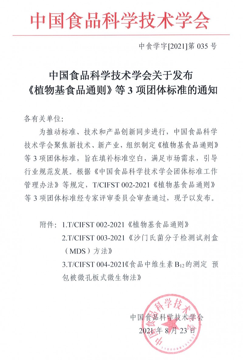 附件: TCIFST 002-2021《植物基食品通則》.pdf TCIFST 003-2021《沙門氏菌分子檢測試劑盒(MDS)方法》.pdf TCIFST 004-2021《食品中維生素B12的測定 預包被微孔板式微生物法》.pdf