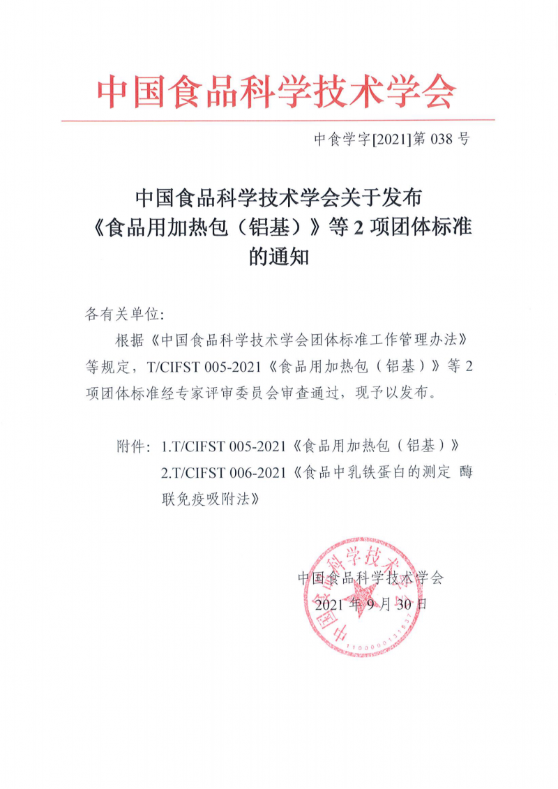 附件: T/CIFST 005-2021 食品用加熱包(鋁基) T/CIFST 006-2021 食品中乳鐵蛋白的測定 酶聯免疫吸附法