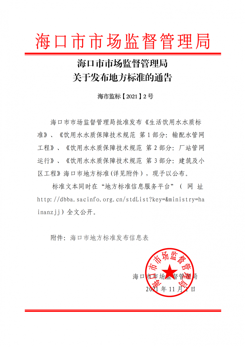 海口市市場監督管理局關于發布《生活飲用水水質標準》等地方標準的通告(海市監標【2021 】2號)