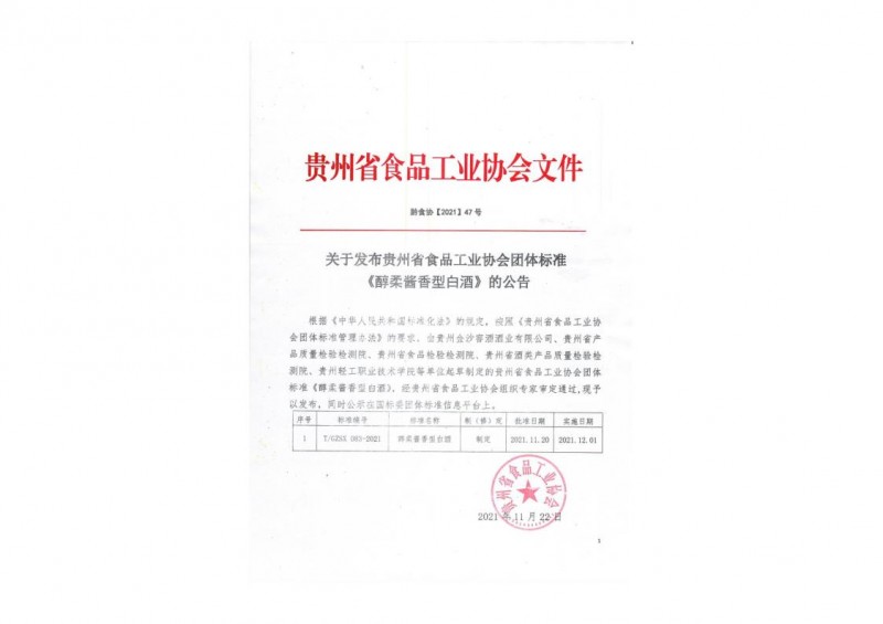 | 1 | T/GZSX 083-2021 | 醇柔醬香型白酒 | 制定 | 2021.11.20 | 2021.12.01 |