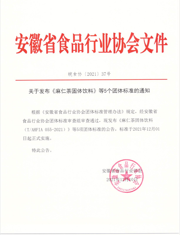 | 1 | T/AHFIA 055-2021 | 麻仁茶固體飲料 | 2021-11-26 | 2021-12-01 |