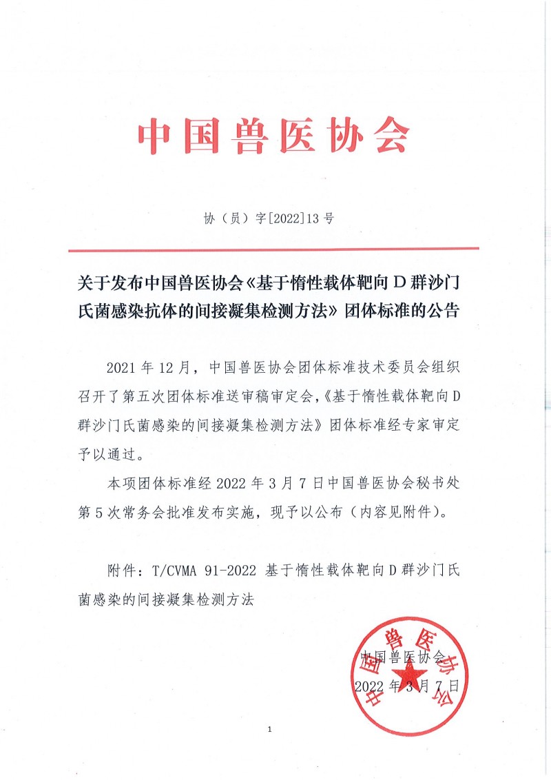 全文下載:關于發布中國獸醫協會《基于惰性載體靶向D群沙門氏菌感染抗體的間接凝集檢測方法》團體標準的公告.pdf