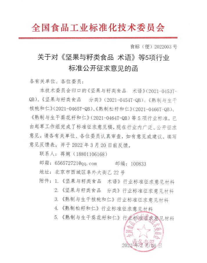 以上為全國食品工業標準化技術委員會關于對《堅果與籽類食品 術語》等5項行業標準公開征求意見的函(食標(便)2022003號)的檢測服務介紹,如有其他疑問可聯系在線工程師!