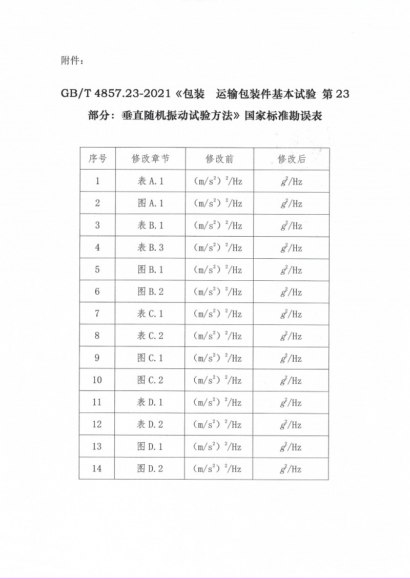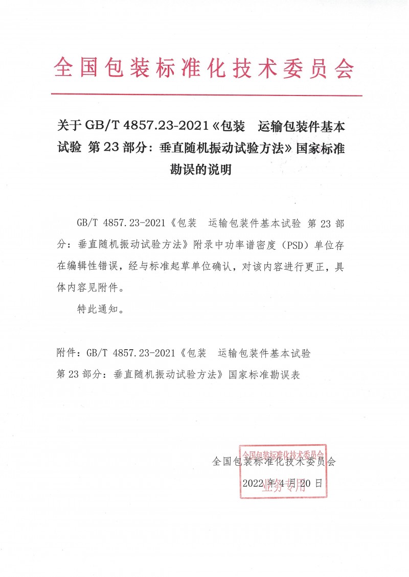 以上為全國包裝標準化技術委員會關于GB T4857.23-2021《包裝 運輸包裝件基本實驗 第23部分》國標勘誤說明的檢測服務介紹,如有其他疑問可聯系在線工程師!