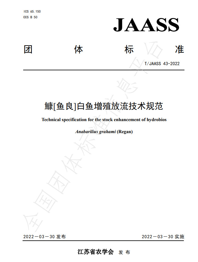 2022年3月30日,江蘇省農(nóng)學(xué)會(huì)團(tuán)體標(biāo)準(zhǔn)《鱇[魚(yú)良]白魚(yú)增殖放流技術(shù)規(guī)范》正式發(fā)布,標(biāo)準(zhǔn)編號(hào)為“T/JAASS 43-2022”。該標(biāo)準(zhǔn)是國(guó)家重點(diǎn)研發(fā)計(jì)劃“藍(lán)色糧倉(cāng)科技創(chuàng)新”重點(diǎn)專(zhuān)項(xiàng)“高原湖泊漁業(yè)資源與生物多樣性保護(hù)模式示范”的重要產(chǎn)出成果之一,由中國(guó)科學(xué)院南京地理與湖泊研究所作為牽頭單位,玉溪市撫仙湖管理局、云南茂灣水產(chǎn)養(yǎng)殖有限責(zé)任公司作為參與單位共同編制。