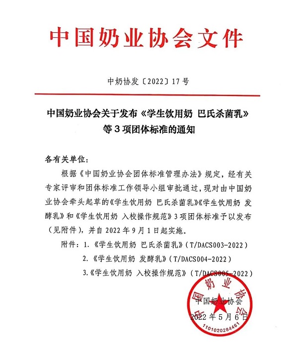 T/DACS 003-2022 學生飲用奶 巴氏殺菌乳 T/DACS 004-2022 學生飲用奶 發酵乳 T/DACS 005-2022 學生飲用奶 入校操作規范