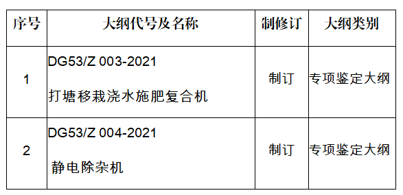 根據《農業機械試驗鑒定辦法》(農業農村部令2018年第3號)、農業農村部《關于印發〈農業機械試驗鑒定工作規范〉的通知》(農機發〔2019〕3號)有關規定,《打塘移栽澆水施肥復合機》《靜電除雜機》等2項專項鑒定大綱經過專家評審通過,現予發布,自2022年5月30日起實施。