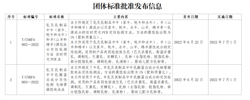 中國(guó)營(yíng)養(yǎng)保健食品協(xié)會(huì)批準(zhǔn)發(fā)布《乳及乳制品中牛(家牛、牦牛和水牛)和羊(山羊和綿羊)源性成分定性檢測(cè)方法 實(shí)時(shí)熒光PCR法》(T/CNHFA 002-2022)團(tuán)體標(biāo)準(zhǔn)和《乳及乳制品中牛乳酪蛋白成分定性檢測(cè) 毛細(xì)管凝膠電泳法》(T/CNHFA 003-2022)團(tuán)體標(biāo)準(zhǔn),現(xiàn)予公告,自2022年7月1日起實(shí)施。