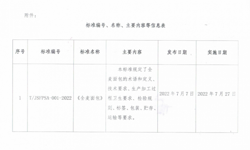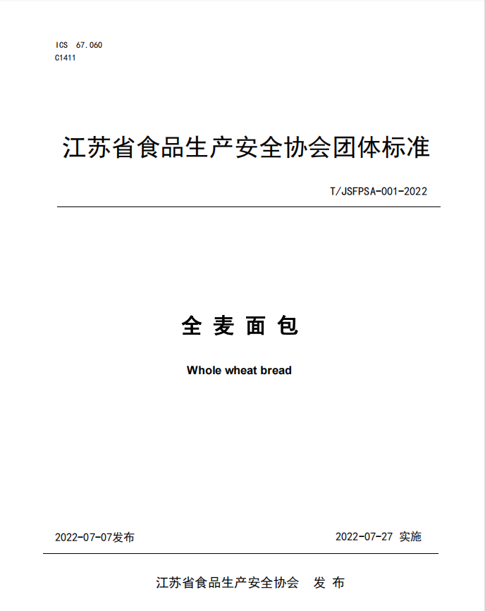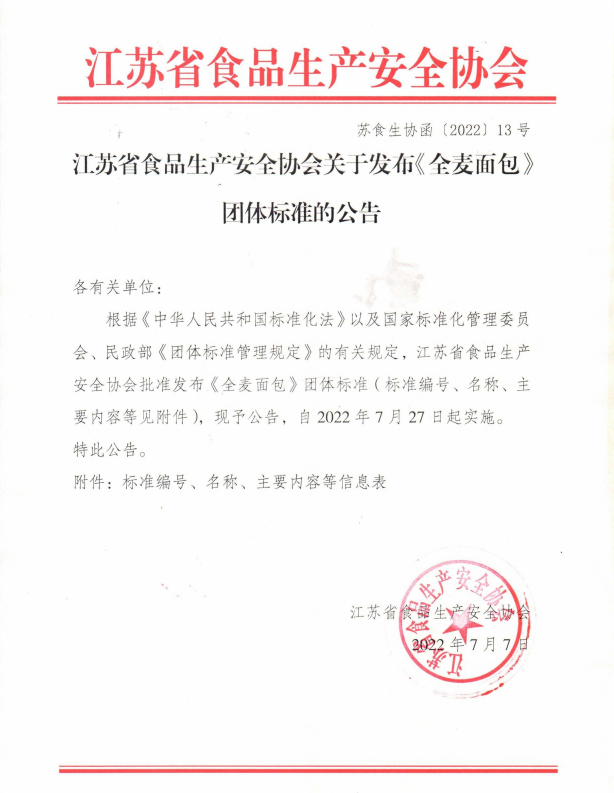 根據(jù)《中華人民共和國(guó)標(biāo)準(zhǔn)化法》以及國(guó)家標(biāo)準(zhǔn)化管理委員會(huì)、民政部《團(tuán)體標(biāo)準(zhǔn)管理規(guī)定》的有關(guān)規(guī)定,江蘇省食品生產(chǎn)安全協(xié)會(huì)批準(zhǔn)發(fā)布《全麥面包》團(tuán)體標(biāo)準(zhǔn)(標(biāo)準(zhǔn)編號(hào)、名稱、主要內(nèi)容等見(jiàn)附件),現(xiàn)予公告,自2022年7月27日起實(shí)施。