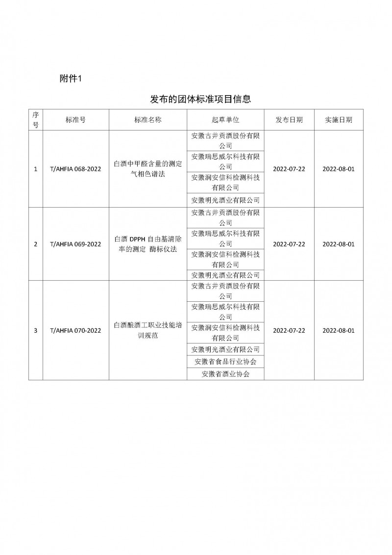 T/AHFIA 068-2022 白酒中甲醛含量的測定 氣相色譜法 T/AHFIA 069-2022 白酒DPPH自由基清除率的測定 酶標儀法 T/AHFIA 070-2022 白酒釀酒工職業技能培訓規范