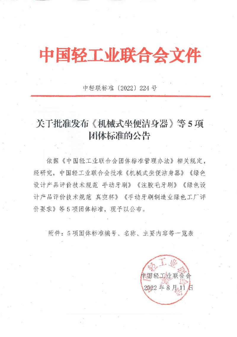1、關于批準發布《機械式坐便潔身器》等5項團體標準的公告
