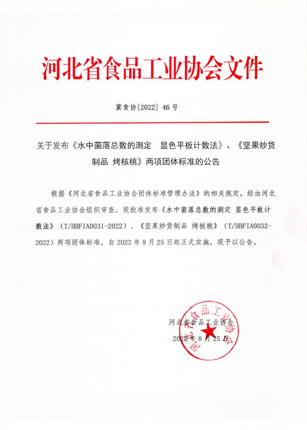 河北省食品工業協會關于發布《水中菌落總數的測定 顯色平板計數法》、《堅果炒貨制品 烤核桃》兩項團體標準的公告(冀食協[2022]46號)