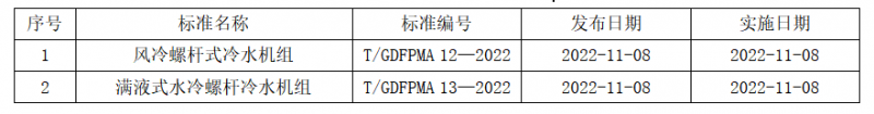 根據(jù)《廣東省食品和包裝機械行業(yè)協(xié)會團體標(biāo)準(zhǔn)制定程序》有關(guān)規(guī)定,由廣州市凌靜制冷設(shè)備有限公司牽頭起草的《風(fēng)冷螺桿式冷水機組》和《滿液式水冷螺桿冷水機組》兩項團體標(biāo)準(zhǔn),已通過專家組審查,現(xiàn)予批準(zhǔn)發(fā)布,標(biāo)準(zhǔn)相關(guān)信息如下: