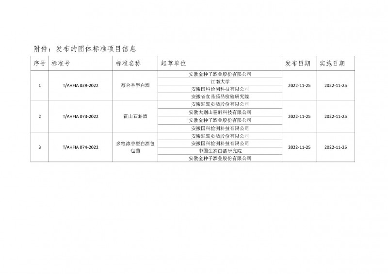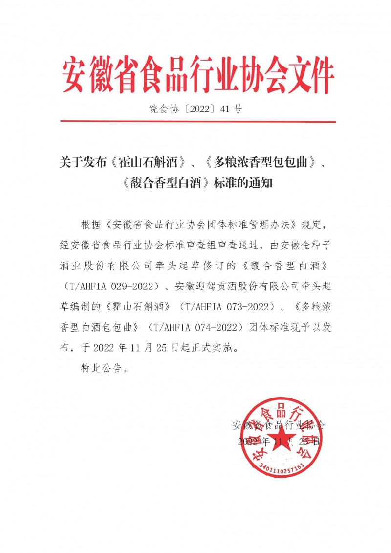 T/AHFIA 029-2022 馥合香型白酒 T/AHFIA 073-2022 霍山石斛酒 T/AHFIA 074-2022 多糧濃香型白酒包包曲