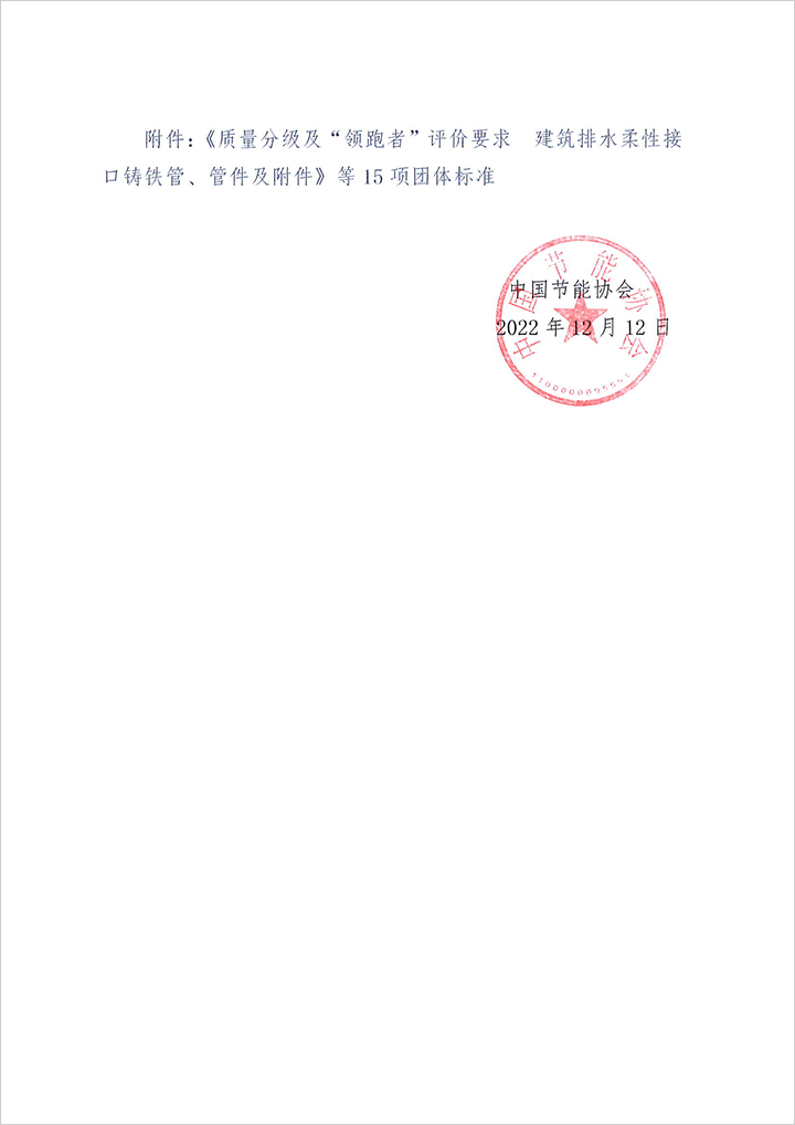 關于批準發布《質量分級及“領跑者”評價要求 建筑排水柔性接口鑄鐵管、管件及附件》等15項團體標準的公告.PDF