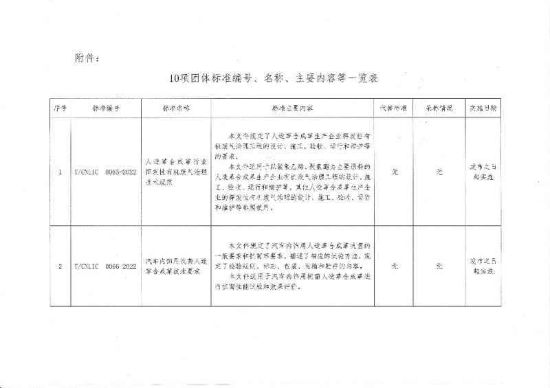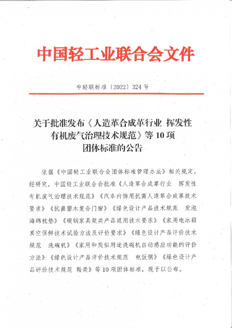 以上為中國輕工業(yè)聯(lián)合會關于批準發(fā)布《人造革合成革行業(yè) 揮發(fā)性有機廢氣治理技術規(guī)范》等10項團體標準的公告(中輕聯(lián)標準[2022]324號)的檢測服務介紹,如有其他疑問可聯(lián)系在線工程師!