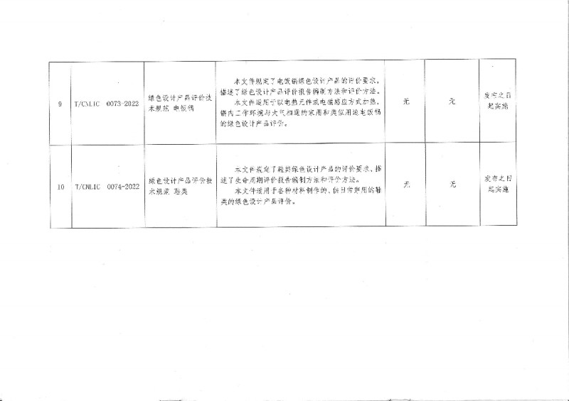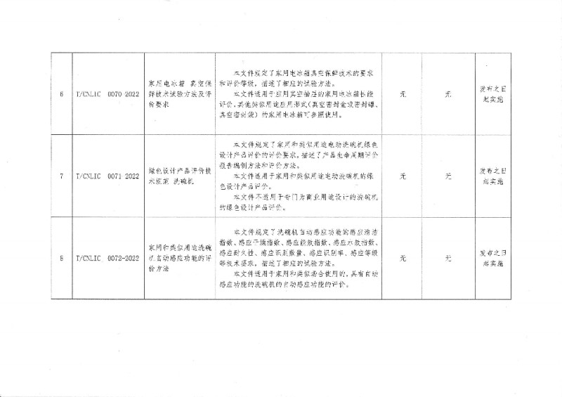 T/CNLIC 0070-2022 家用電冰箱 真空保鮮技術試驗方法及評價要求 T/CNLIC 0071-2022 綠色設計產(chǎn)品評價技術規(guī)范 洗碗機 T/CNLIC 0072-2022 家用和類似用途洗碗機自動感應功能的評價方法 T/CNLIC 0073-2022 綠色設計產(chǎn)品評價技術規(guī)范 電飯鍋