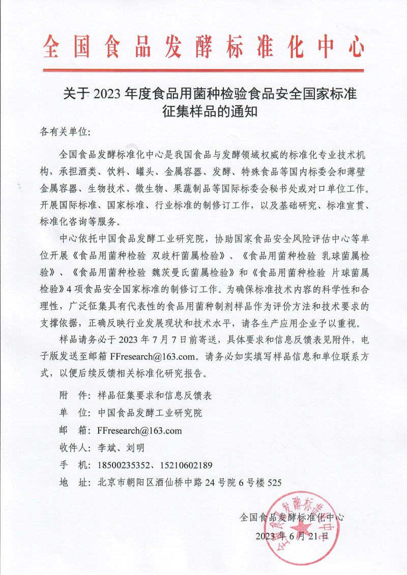 以上為全國食品發酵標準化中心關于2023年度食品用菌種檢驗食品安全國家標準征集樣品的通知的檢測服務介紹,如有其他疑問可聯系在線工程師!
