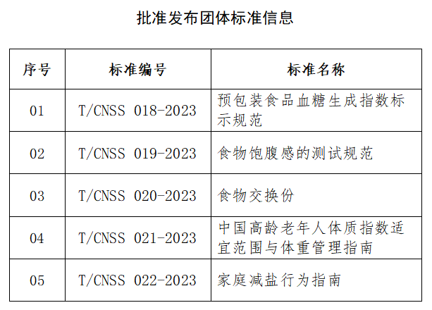 根據《中國營養學會團體標準管理辦法》,經中國營養學會法規標準工作委員會組織審查,批準發布《預包裝食品血糖生成指數標示規范》(T/CNSS 018-2023)、《食物飽腹感的測試規范》(T/CNSS 019-2023)、《食物交換份》(T/CNSS 020-2023)、《中國高齡老年人體質指數適宜范圍與體重管理指南》(T/CNSS 021-2023)、《家庭減鹽行為指南》(T/CNSS 022-2023)5項團體標準,現予公告。