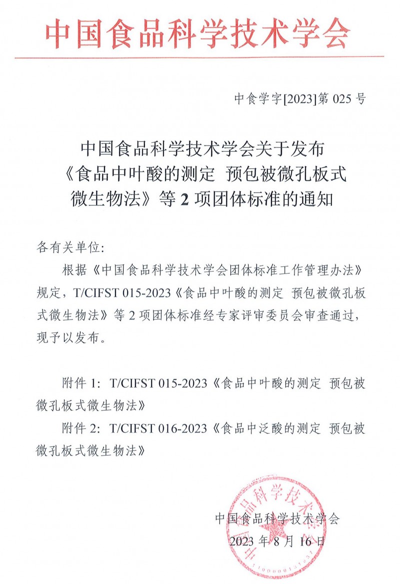 以上為中國食品科學技術學會關于發布《食品中葉酸的測定 預包被微孔板式微生物法》等2項團體標準的通知(中食學字[2023]第025號)的檢測服務介紹,如有其他疑問可聯系在線工程師!