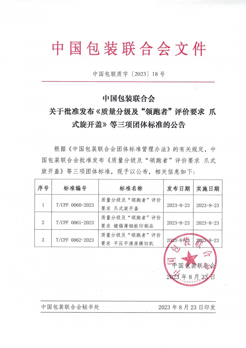 以上為中國包裝聯(lián)合會關(guān)于批準(zhǔn)發(fā)布《質(zhì)量分級及“領(lǐng)跑者”評價要求 爪式旋開蓋》等三項團體標(biāo)準(zhǔn)的公告(中國包聯(lián)質(zhì)字[2023]18號)的檢測服務(wù)介紹,如有其他疑問可聯(lián)系在線工程師!